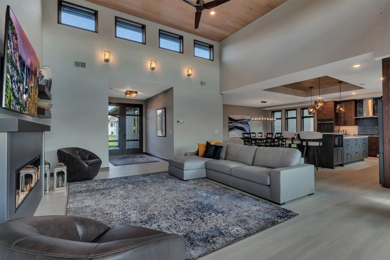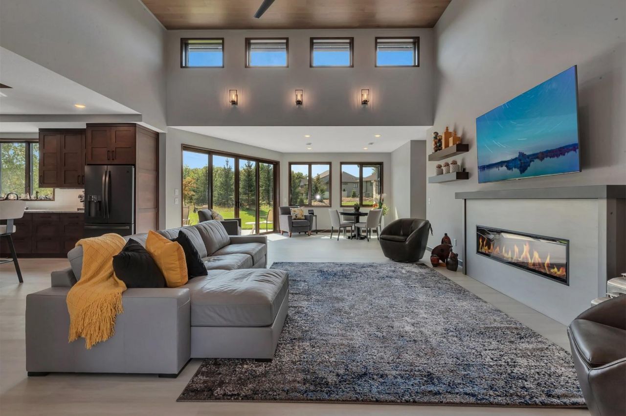 This spacious patio home stands out from the moment you approach the double front doors, offering exceptional design and craftsmanship throughout. Inside, the foyer opens to a dramatic great room highlighted by a 16 ft high wood ceiling and transom windows that fill the space with natural light. The open layout seamlessly connects the living room, kitchen, dining area, and sunroom, all anchored by an electric fireplace and enhanced with Hunter Douglas remote-controlled blinds, hard flooring, and warm cherry millwork. The kitchen is functional and designed for entertaining, featuring extra-deep cabinetry, a painted center island, quartzite stone countertops, dual ovens, a 36-inch gas cooktop, and a wine chiller, with a high ceiling that transitions from 9 to 10 ft accented in wood. The dining area easily accommodates large gatherings, while the sunroom showcases an expansive 8x12 ft patio door facing south with thoughtfully designed overhangs to control the sun-gain for year-round comfort. The primary suite offers an impressive bath with dual vanities, a zero-entry tile shower, and walk-in closet, while the second bedroom includes a semi-private walk-through bath ideal for guests. There is a full bath near two additional bedrooms, which provide flexible space for a den, office, or exercise room. The home has 7'8 custom doors and forced air and in-floor heat. The oversized heated 42x24 garage includes additional storage above. The home sits on a 0.53 acre lot, just down from the neighborhood pool. Originally built as the builder's personal residence, it includes premium upgrades and efficiency features throughout and was recognized within the Xcel Energy MN service area as the Energy Efficiency Home of the Year when it was built!