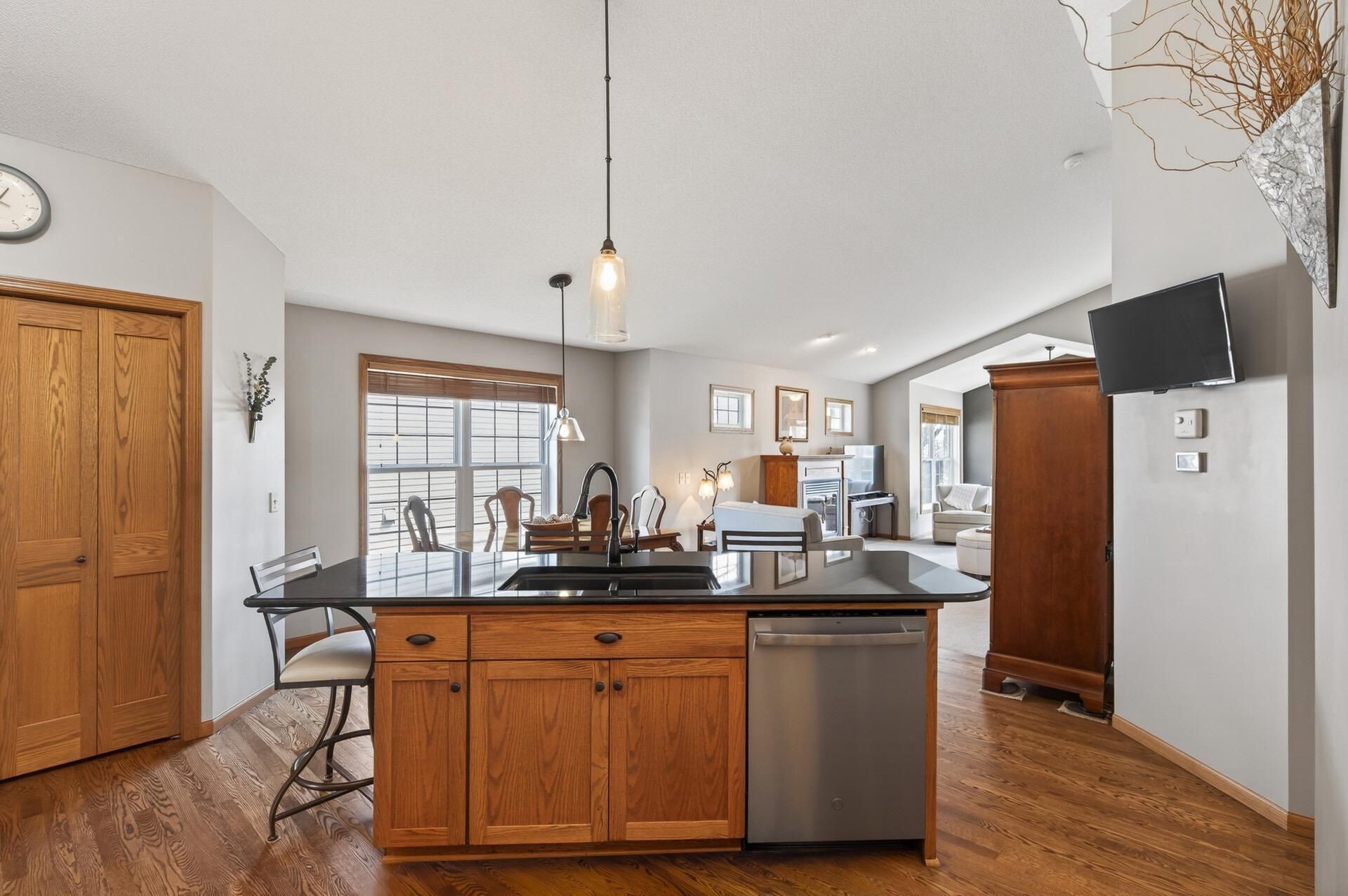 Welcome to this pristine, open concept, main-level-living 3 bedroom, 3 bathroom townhome in the heart of Rockford, MN! Beautiful oak hardwood flooring from entry to the living room. This home radiates with natural light, elevated by the vaulted ceilings. Kitchen features solid mission style cabinetry, solid surface quartz counter tops, as well as a granite island. Laundry on main level. Custom finished lower level with wet bar area and walkout patio facing Carver Park. 2 gas fireplaces (and lower level is 3-sided). This end-unit 3 bedroom, 3 bath townhome won't last long! New roof 2020. 2 miles away from Lake Rebecca Park Reserve and all the trails & parks it has to offer. Conveniently located just 15-20 minutes from Plymouth and Maple Grove.